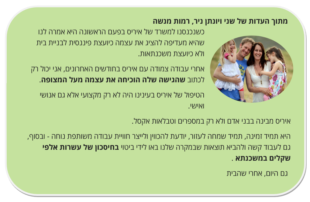 איריס שוסטר, יועצת משכנתאות ומתכננת פיננסית. מלווה כלכלית בונים כבר יותר מ 13 שנה. עד היום ליוויתי מעל 1,000 לקוחות מתוכם יותר מ 450 בתהליכי בניית הבית שלהם.