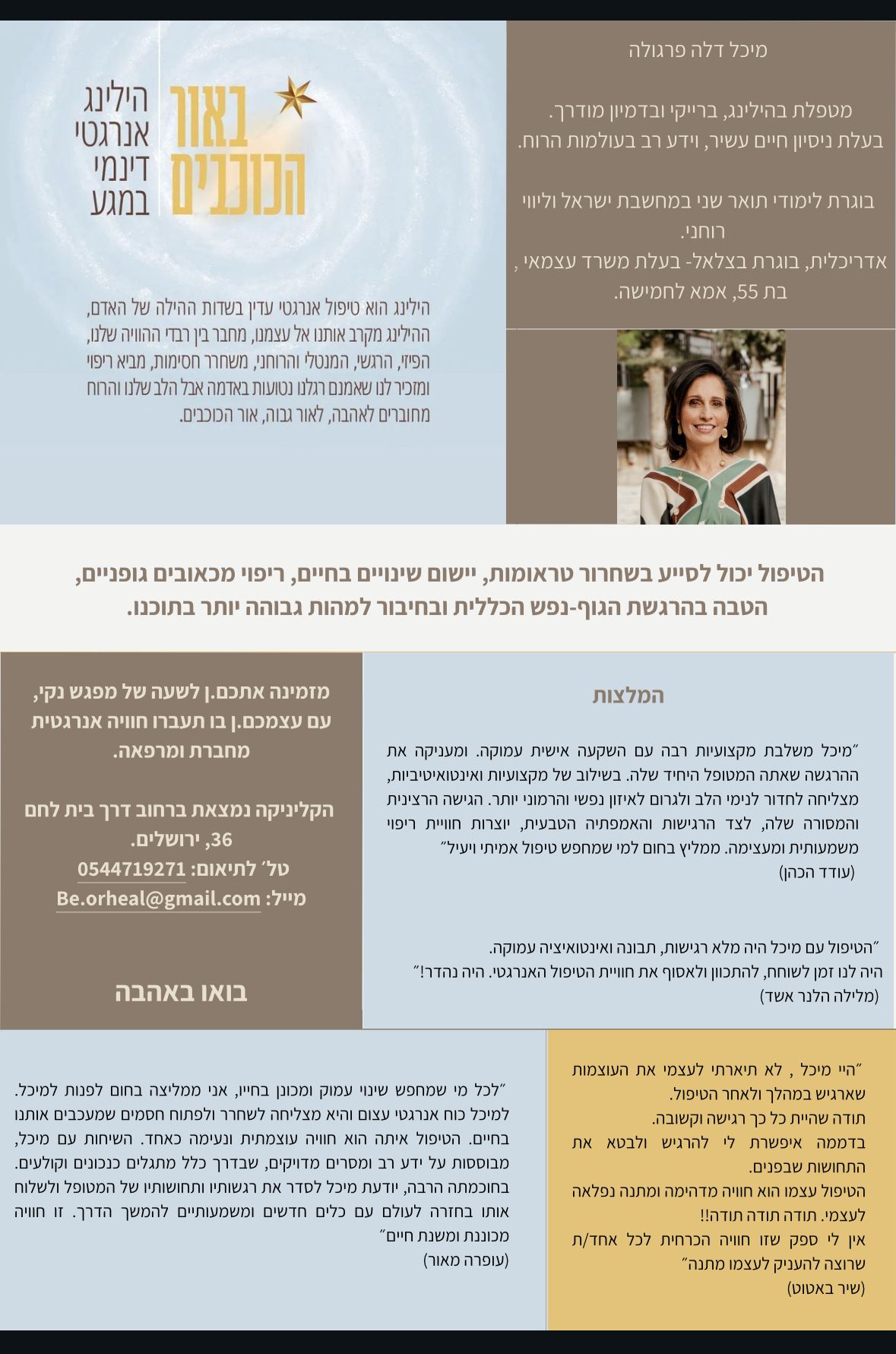 אני נמצאת בעולמות הטיפול האלטרנטיבי כבר 15 שנים כמטפלת מקצועית . גם לפני כן תמיד היה לי חיבור לטבע, לפשטות של החיים, להבנה שיש הרבה יותר ממה שרואים וחווים במציאות הקיימת. עם השנים, דרך חקירה, התנסויות ולמידה התקרבתי והתחברתי למהות האמיתית שלי כנשמה שהגיעה לכאן עם תפקיד להביא ריפוי,לחבר את האנשים לכוחות החיים הטמונים בתוכם. וזה מה שאני עושה בקליניקה שלי ובחיים בכלל.