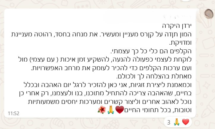 ירדן מובילה הכשרות למטפלים, מאמנים ומנחים, ומשלבת בעבודתה שיטתיות, יצירתיות ותפיסה תהליכית עמוקה, לצד כלים מעשיים לשימוש מיידי בקליניקה, בקבוצה או בארגון.